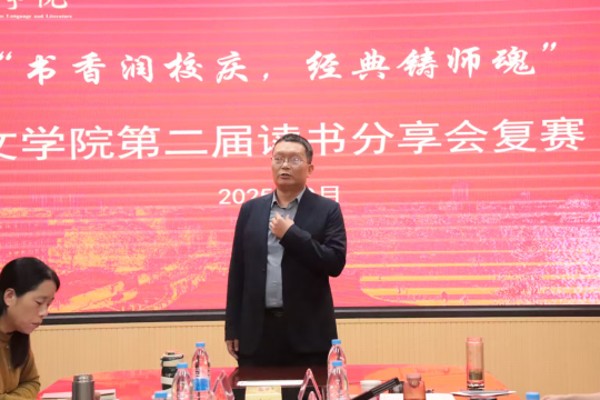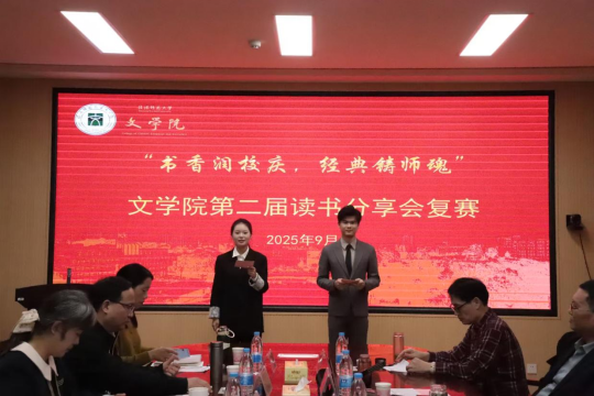 为营造良好的阅读氛围,拓宽思维视野,促进思想交流与碰撞,提升文院学子的人文素养与思辨能力。9月28日,十大亚洲博彩平台排行榜 于人文楼会议室隆重举办第二届“书香润校庆,经典铸师魂”读书分享会复赛。本次活动特邀十大亚洲博彩平台排行榜 副院长徐洪军、各教研室主任组成专业评审团,共同聆听经典回响,品评阅读感悟。赛事由尹怡凡、周诗文联袂主持,现场氛围庄重而热烈,尽显文院风华。