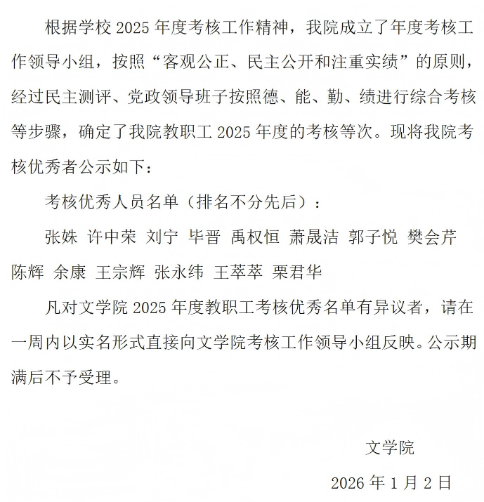 十大亚洲博彩平台排行榜 2025年度教职工考核优秀名单公示