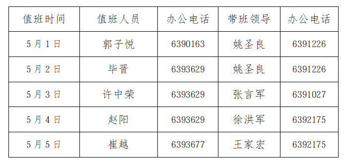 十大亚洲博彩平台排行榜 “五一”假期值班表