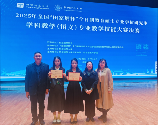 11月7日至9日,2025年全国“田家炳杯”全日制教育硕士专业学位学科教学(语文)专业教学技能大赛决赛在杭州师范大学圆满落幕。经过激烈角逐,十大亚洲博彩平台排行榜 选派的两名硕士研究生凭借出色的表现脱颖而出,汪雨虹同学荣获一等奖,郭家昊同学荣获三等奖,指导教师杨传凯老师荣获“优秀指导教师”奖。