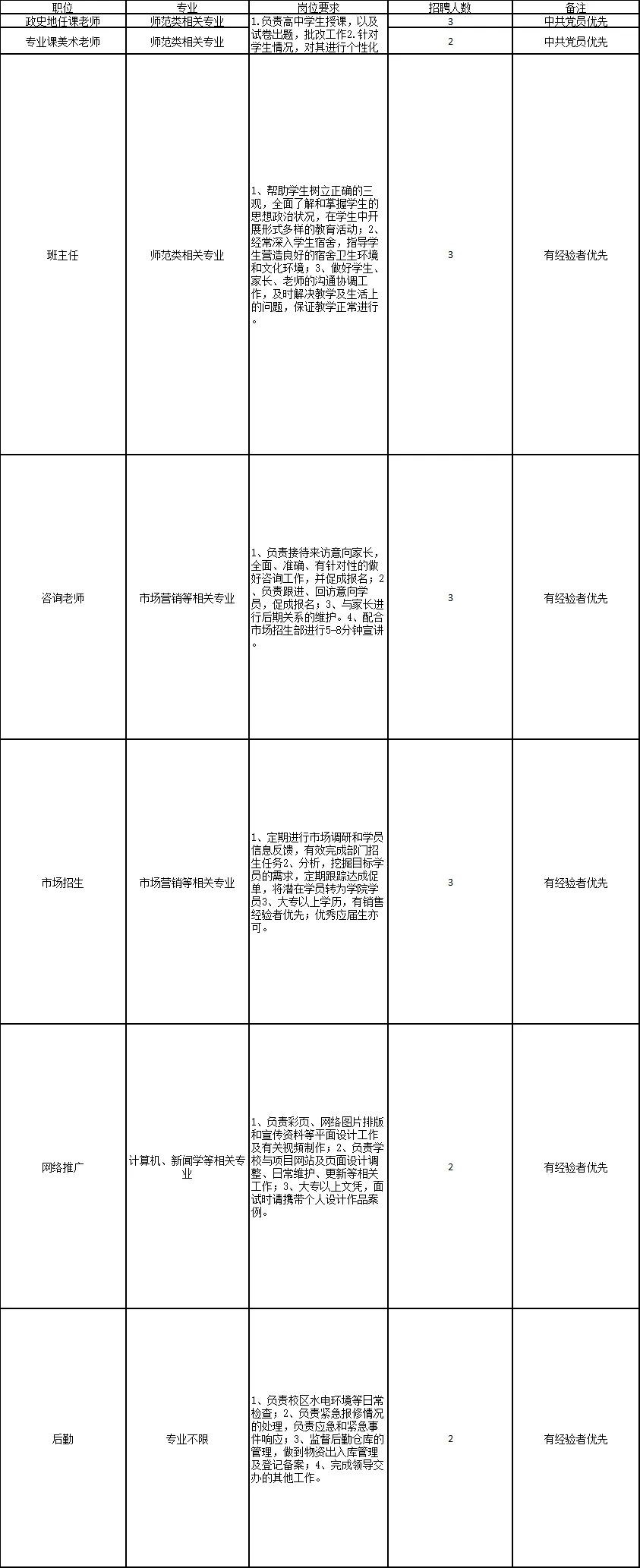 2、品德良好,责任心强。具有团队协作精神,服从学校工作安排,热爱教育事业,具备较强的专业技能水平;